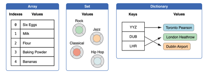Swift는 값 컬렉션을 저장하기 위해 배열(Array), 집합(Set) 및 사전(Dictionary)으로 알려진 세 가지 기본 컬렉션 타입을 제공합니다.