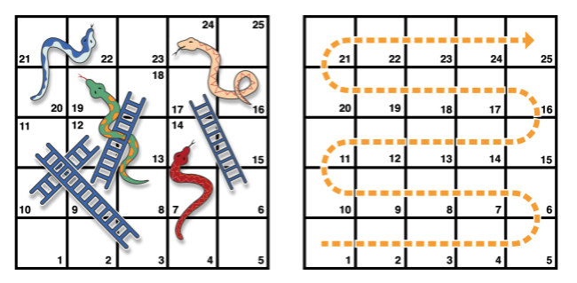사다리 바닥이 있는 사각형은 보드 위로 이동하는 양수인 반면, 뱀 머리가 있는 사각형은 보드 아래로 다시 이동하는 음수를 갖습니다.